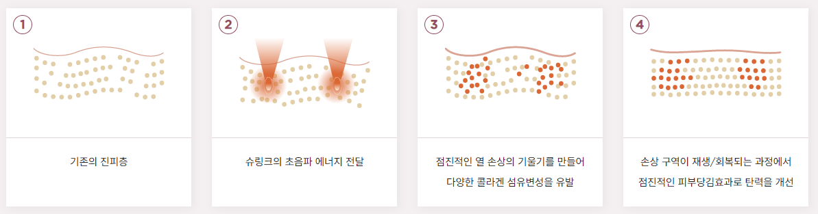 초음파리프팅레이저 슈링크는 피하근막과 피부층에 초음파에너지를 전달하고 전달된 초음파 에너지가 열응고점을 형성하여 콜라겐 생성을 촉진하게 됩니다. 이를 통해 피부 탄력을 회복시켜 얼굴선을 정리해주고, 처진지방을 줄이며, 안색을 밝게 합니다.
